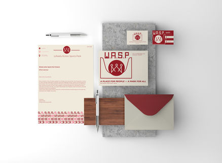 Custom stationery set and business collateral showcasing the Wheels Action Sports Park brand identity.